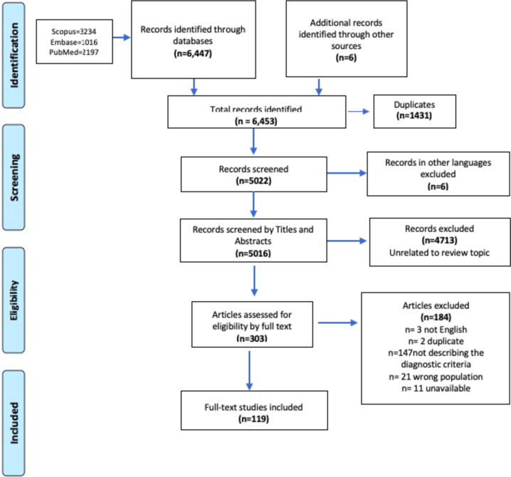 Methods: Three online databases were searched from inception to April 2022 for any English language original manuscripts identifying, describing, or assessing the clinical presentation and diagnostic criteria of the nine most common conditions that cause EILP. We included manuscripts considering all adults with any reported diagnostic criteria for EILP in any setting. Methodological quality was assessed using the Mixed Method Appraisal tool. Condition definitions were identified and categorised during data charting. Twenty-five potential elements of the history, 24 symptoms, 41 physical signs, 21 investigative tools, and 26 overarching diagnostic criteria, were identified and coded as counts of recommendation per condition, alongside qualitative analysis of the clinical reasoning. Condition definitions were constructed with 11 standardised elements based on recent consensus exercises for other conditions.