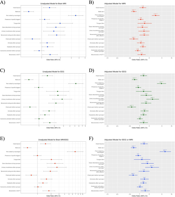 Results: A total of 1882 patients with VVS were analyzed, among which 810 underwent MRI (43.04%), 985 underwent EEG (52.34%), and 1166 underwent MRI or EEG (61.96%). Head trauma (OR 1.38, 95% CI 1.06 to 1.80), previous neurologist visit (OR 6.28, 95% CI 4.24 to 9.64), and gaze disturbance during syncope (OR 1.75, 95% CI 1.13 to 2.78) were all positively associated to the performance of brain MRI/EEG. Similar results were found for urinary incontinence (OR 2.415, 95% CI 1.494 to 4.055), amnesia (OR 1.421, 95% CI 1.053 to 1.930), headache after syncope (OR 1.321, 95% CI 1.046 to 1.672), and tonic-clonic movements in head-up tilt table test (OR 1.501, 95% CI 1.087 to 2.093). However, male sex (OR 0.655, 95% CI 0.535 to 0.800) and chest pain before syncope (OR 0.628, 95% CI 0.459 to 0.860) had significant negative associations with performing brain MRI/EEG.