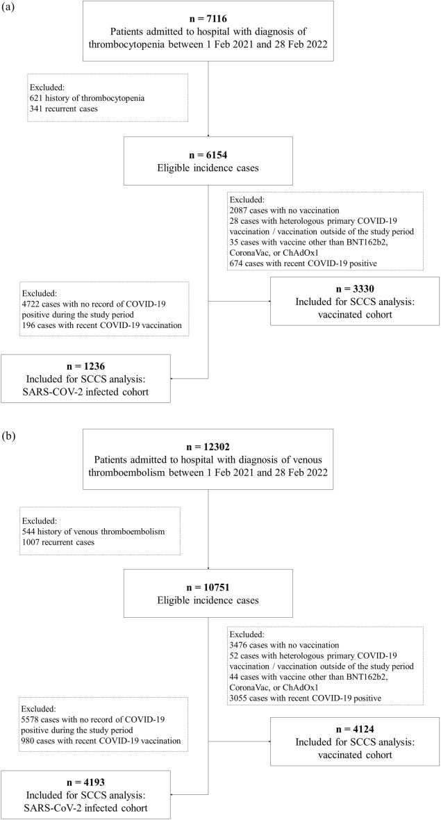Thrombocytopenia and venous thromboembolic events after BNT162b2, CoronaVac, ChAdOx1 vaccines and SARS-CoV-2 infection: a self-controlled case series study