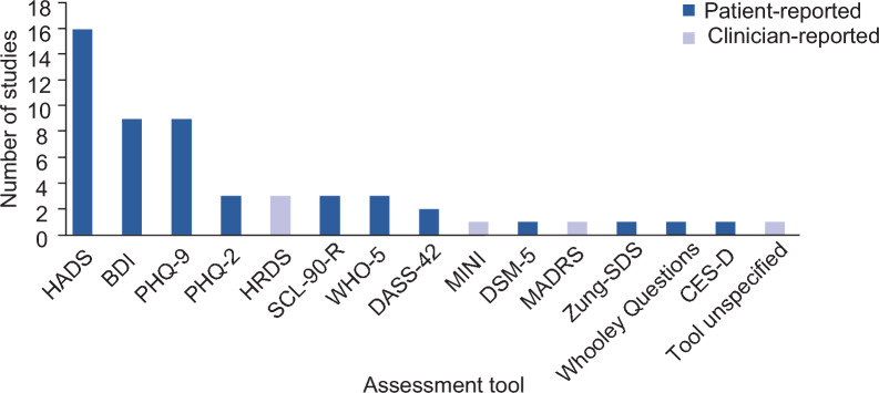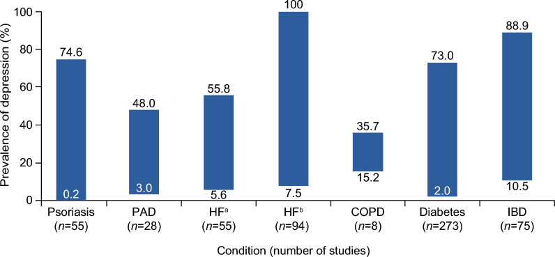 Psoriasis is associated with various comorbidities with a notable psychosocial burden. This systematic literature review explores the burden of depression in patients with psoriasis, comparing it with that experienced by patients with other chronic medical conditions. Embase via Ovid, PubMed, and Cochrane Database of Systematic Reviews via Ovid were searched for peer-reviewed studies published in English between January 1, 2016 and December 6, 2021 that reported real-world evidence or observational studies involving at least 100 adults (age ≥ 18 years) with general (unspecified) or plaque psoriasis experiencing symptoms of depression (but not restricted to patients with a clinical diagnosis). Any report of depression or suicidality was eligible for inclusion. Systematic literature reviews reporting depression/suicidality in other chronic medical conditions were also included. Statistical analysis was not performed; the study was descriptive only. A total of 1744 records were identified, and after several defined screenings by two independent reviewers for publication year, relevance, and sample size, 82 publications were included. Psoriasis was significantly associated with depression. The prevalence of depression in patients with psoriasis ranged from 0.2% to 74.6%, with incidence from 4.83 to 91.9 per 1000 person-years. The prevalence of depression was generally higher among patients with more severe psoriasis than those with less severe disease (as determined by Psoriasis Area Severity Index [PASI] scoring system) and was more prevalent among women than men with psoriasis. Depression in psoriasis significantly reduced quality of life, including factors such as sexual dysfunction, sleep difficulties, subjective well-being, and addictions. Comorbid hypertension, hyperlipidemia, psoriatic arthritis, obesity, inflammatory bowel disease, diabetes, and statin use were all associated with increased depression risk in patients with psoriasis. This systematic literature review found that the burden of depression in psoriasis is no lower than in other chronic medical conditions. Greater awareness of the psychological impact of psoriasis would improve care and management, which should incorporate psychological interventions.