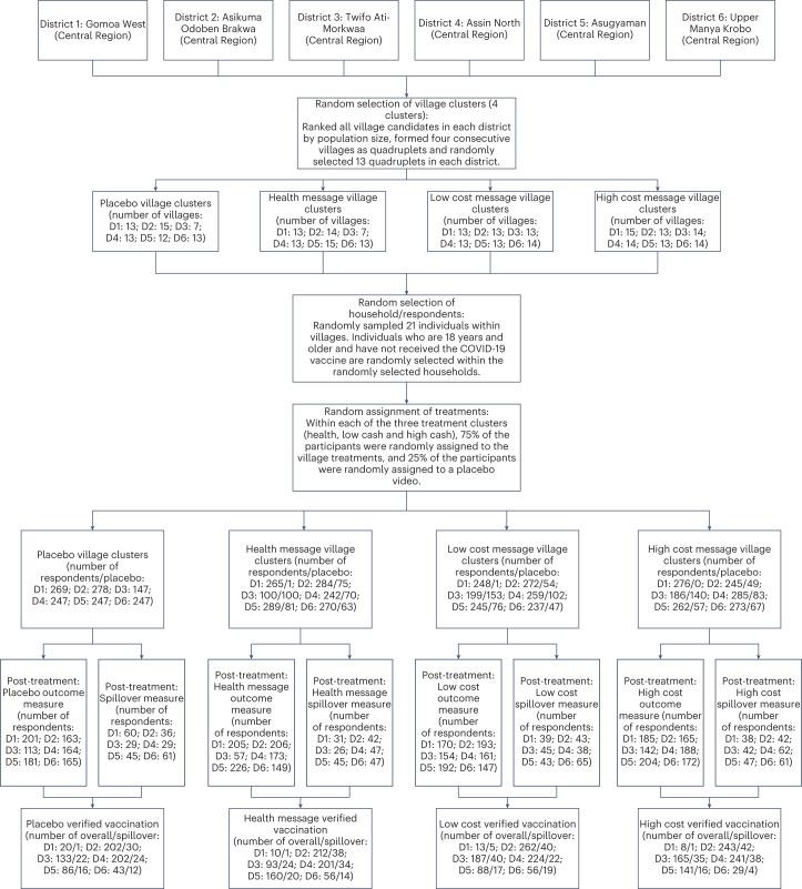 We implemented a clustered randomized controlled trial with 6,963 residents in six rural Ghana districts to estimate the causal impact of financial incentives on coronavirus disease 2019 (COVID-19) vaccination uptake. Villages randomly received one of four video treatment arms: a placebo, a standard health message, a high cash incentive (60 Ghana cedis) and a low cash incentive (20 Ghana cedis). For the first co-primary outcome-COVID-19 vaccination intentions-non-vaccinated participants assigned to the cash incentive treatments had an average rate of 81% (1,733 of 2,168) compared to 71% (1,895 of 2,669) for those in the placebo treatment arm. For the other co-primary outcome of self-reported vaccinations 2 months after the initial intervention, the average rate for participants in the cash treatment was 3.5% higher than for participants in the placebo treatment (95% confidence interval (CI): 0.001, 6.9; P = 0.045): 40% (602 of 1,486) versus 36.3% (672 of 1,850). We also verified vaccination status of participants: in the cash treatment arm, 36.6% (355 of 1,058) of verified participants had at least one dose of the COVID-19 vaccine compared to 30.3% (439 of 1,544) for those in the placebo-a difference of 6.3% (95% CI: 2.4, 10.2; P = 0.001). For the intention and the vaccination outcomes, the low cash incentive (20 Ghana cedis) had a larger positive effect on COVID-19 vaccine uptake than the high cash incentive (60 Ghana cedis). Trial identifier: AEARCTR-0008775 .
