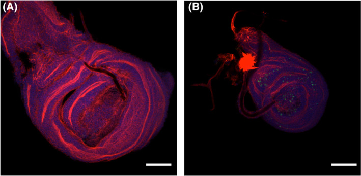 Increase in apoptosis in imaginal discs. Wing imaginal discs were isolated from wild type pupa (A) and from BL‐28432 homozygotes (B), stained for Actin (red) and activated caspase 3 (green) and photographed with a Nikon 90i microscope at 400× magnification. Representative images of at least 12 analyzed imaginal discs are shown. The scale bar is 100 μm.