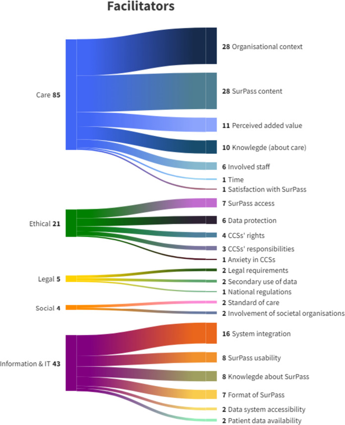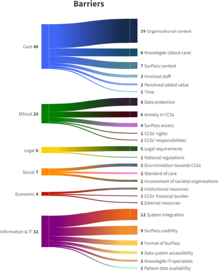 Results: The study identified 115 barriers and 159 facilitators. The main barriers included the lack of standardised LTFU care in centres and network cooperation, uncertainty about SurPass accessibility, and uncertainty about how to integrate SurPass into electronic health information systems. The main facilitators included standardised and coordinated LTFU care in centres, allowing CCSs to conceal sensitive information in SurPass and (semi)automatic data transfer and filing.