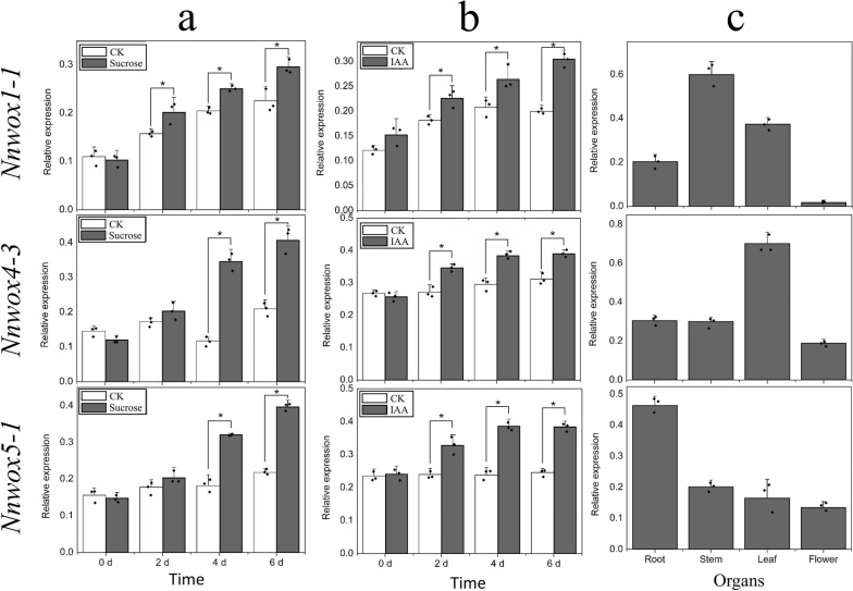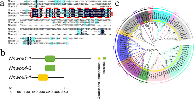 Background: Adventitious roots (ARs) represent an important organ system for water and nutrient uptake in lotus plants because of degeneration of the principal root. The WUSCHEL-related homeobox (WOX) gene regulates plant development and growth by affecting the expression of several other genes. In this study, three WOX genes, NnWOX1-1, NnWOX4-3, and NnWOX5-1, were isolated and their functions were assessed in Arabidopsis plants.