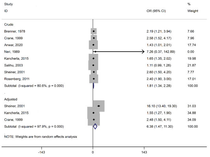 Results: In the initial search, 829 articles were retrieved. Finally, according to the inclusion criteria, eight studies were analyzed in the meta-analysis. A significant association was reported between placenta previa and risk of congenital abnormalities based on crude form (OR = 1.81, 95% CI = 1.34 to 2.28) and adjusted studies (OR = 6.38, 95% CI = 1.47 to 11.30). The high heterogeneity was observed among the studies reported based on adjusted and crude form, respectively (I2 = 97.9%, P = 0.000) (I2 = 80.6%, P = 0.000). Therefore, publication bias was not observed among studies. Seven studies of the included studies were of high quality.