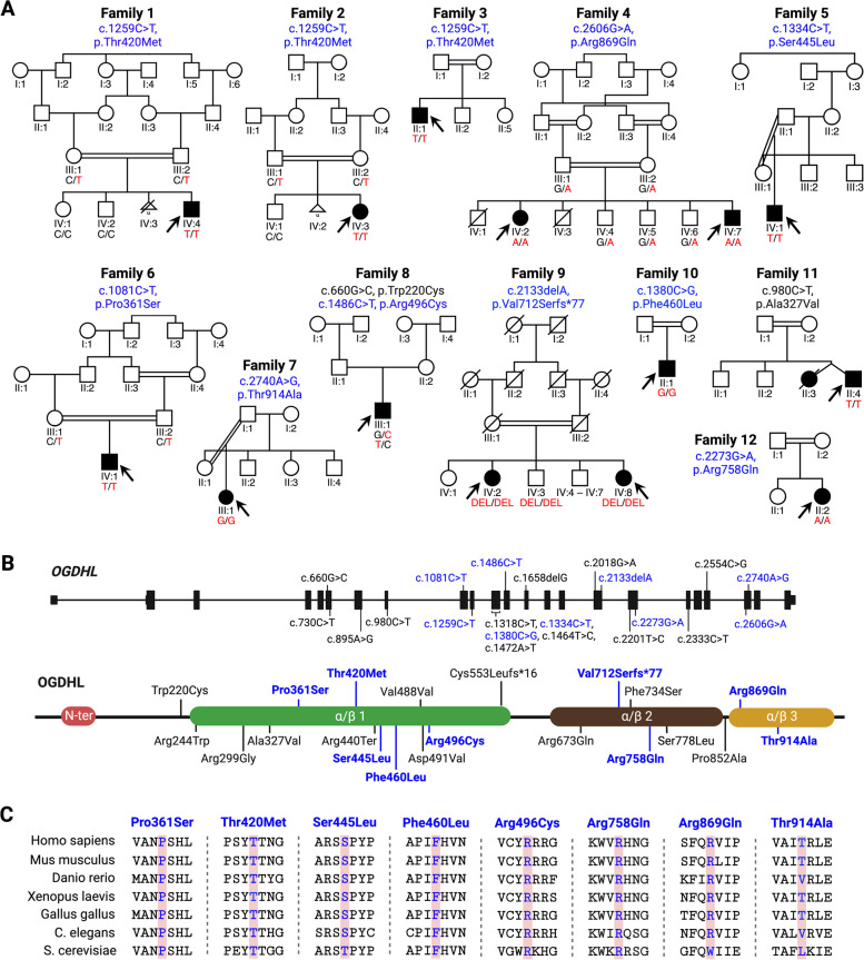 Results: A cohort of 14 individuals from 12 unrelated families exhibited highly variable clinical phenotypes, with the majority of them presenting at least one additional variant, potentially accounting for a blended phenotype and complicating phenotypic understanding. We also uncovered extreme clinical heterogeneity and high allele frequencies, occasionally incompatible with a fully penetrant recessive disorder. Human cDNA of previously described and new variants were tested in an ogdhl zebrafish knockout model, adding functional evidence for variant reclassification. We disclosed evidence of hypomorphic alleles as well as a loss-of-function variant without deleterious effects in zebrafish variant testing also showing discordant familial segregation, challenging the relationship of OGDHL as a conventional Mendelian gene. Going further, we uncovered evidence for a complex compensatory relationship among OGDH, OGDHL, and DHTKD1 isoenzymes that are associated with neurodevelopmental disorders and exhibit complex transcriptional compensation patterns with partial functional redundancy.