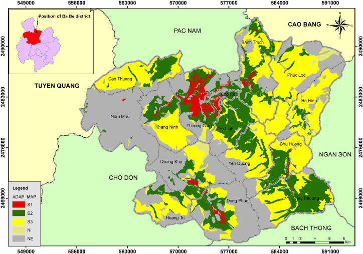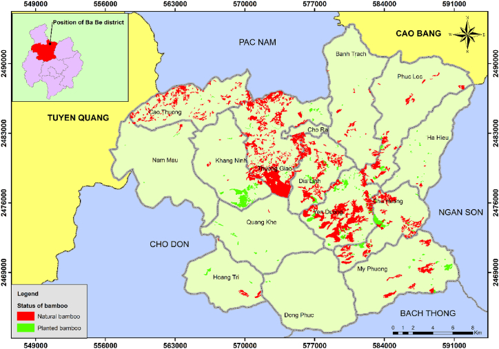 In Vietnamese culture, bamboo holds deep symbolic significance. However, in recent years, as a result of evolving usage patterns and the introduction of alternative materials in the face of a rapidly developing modern market economy, industrialisation, and urbanisation, bamboo's economic and social value has dwindled. Nevertheless, with the pressing challenges of climate change, environmental pollution, and the depletion of natural resources, bamboo is experiencing a resurgence in importance within the lives of Vietnamese people. Ba Be district, situated in Bac Kan province, stands as one of the country's most impoverished regions. Natural bamboo thrives in 14 out of 15 communes, with Dong Phuc commune being the exception. Planted bamboo is found in 14 out of 15 communes, excluding Cho Ra town, covering approximately 7.9 % of the entire district's natural area (NA). The district's vast terrain, featuring slopes exceeding 15°, presents formidable obstacles to socio-economic development. This study aims to shed light on the distribution of bamboo forests in Ba Be district and presents an assessment of bamboo's suitability within its natural surroundings. The study employs the analytical hierarchy process (AHP) method and spatial statistics, using remote sensing data supplied by the Department of Natural Resources and Environment, Ba Be district. The results demonstrate that 60 % of Ba Be district's NA is conducive to bamboo cultivation and growth. The findings of this research provide local authorities with a scientifically grounded basis for strategic planning, enabling bamboo to emerge as a pivotal resource within production forests. This approach outlines the ideal spatial distribution for bamboo cultivation and development, ultimately fostering the sustainable utilisation of local natural resources to support both immediate and long-term local socio-economic development.
