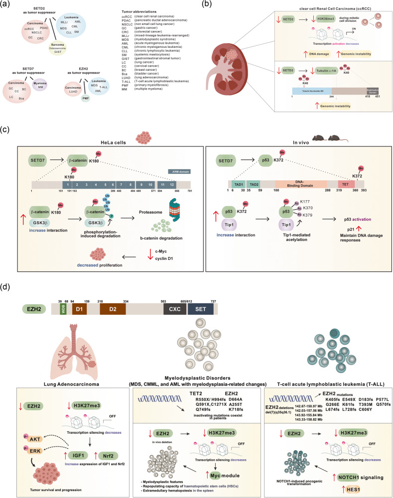 Protein lysine methyltransferases (PKMTs) play crucial roles in histone and nonhistone modifications, and their dysregulation has been linked to the development and progression of cancer. While the majority of studies have focused on the oncogenic functions of PKMTs, extensive evidence has indicated that these enzymes also play roles in tumor suppression by regulating the stability of p53 and β-catenin, promoting α-tubulin-mediated genomic stability, and regulating the transcription of oncogenes and tumor suppressors. Despite their contradictory roles in tumorigenesis, many PKMTs have been identified as potential therapeutic targets for cancer treatment. However, PKMT inhibitors may have unintended negative effects depending on the specific cancer type and target enzyme. Therefore, this review aims to comprehensively summarize the tumor-suppressive effects of PKMTs and to provide new insights into the development of anticancer drugs targeting PKMTs.