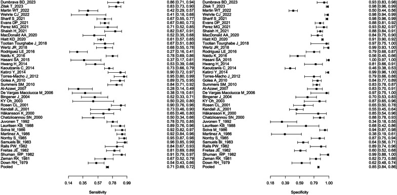 Results: Forty studies with 8,652 patients were included. The majority of studies had a low risk of bias and applicability concerns. US had a pooled sensitivity of 71% (95% CI, 69-72%), a specificity of 85% (95% CI, 84-86%), and an accuracy of 0.83 (95% CI, 0.82-0.83) for the diagnosis of AC. The pooled sensitivity and specificity were 71% (95% CI, 67-74%) and 92% (95% CI, 90-93%) performed by emergency physicians (EPs), 79% (95% CI, 71-85%) and 76% (95% CI, 69-81%) performed by surgeons, and 68% (95% CI 66-71%) and 87% (95% CI, 86-88%) performed by radiologists, respectively. There were no statistically significant differences among the three groups.