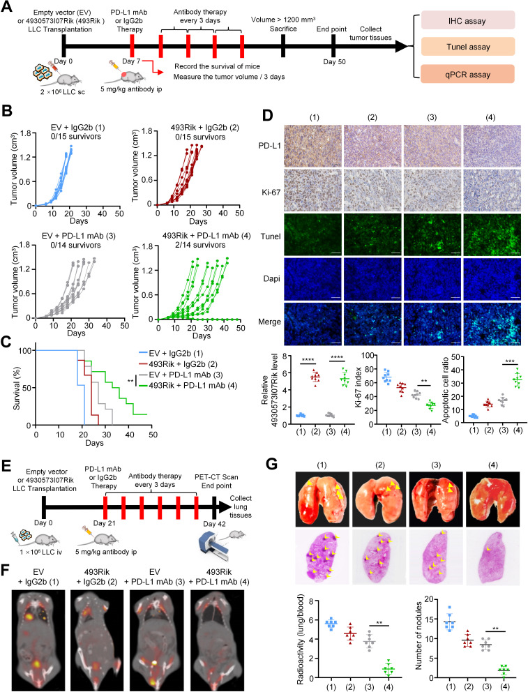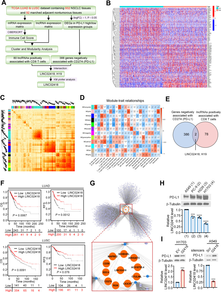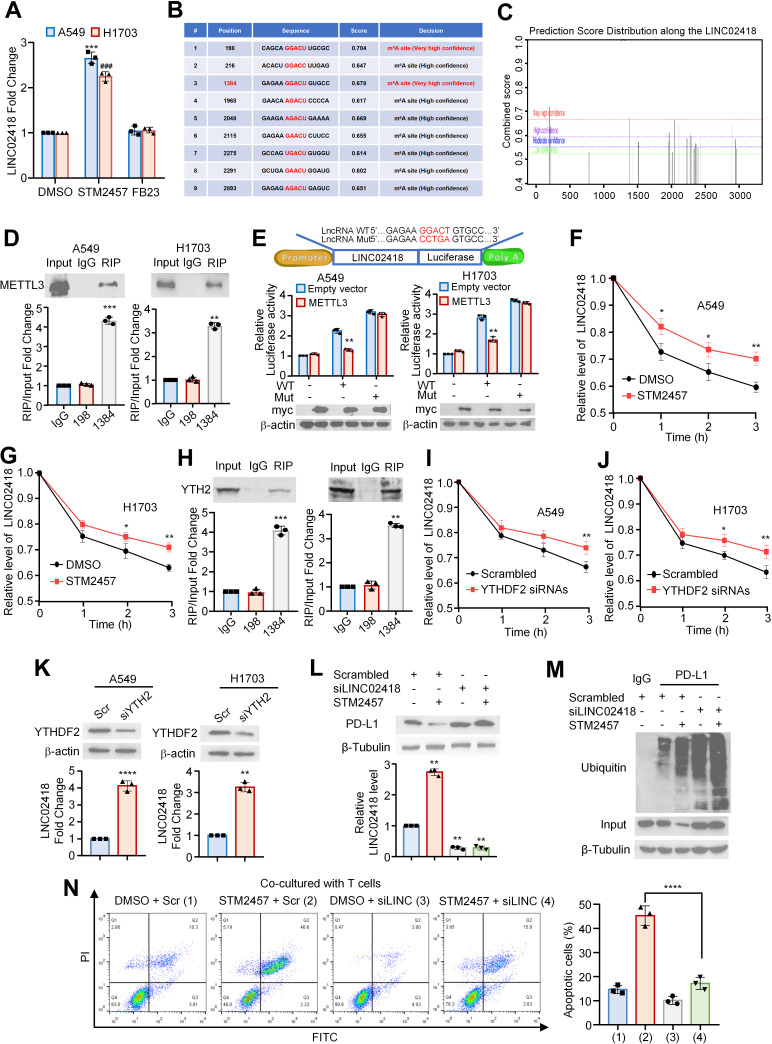 Methods: Bioinformatics analysis was performed to profile and investigate the long non-coding RNAs that negatively correlated with PD-L1 expression and positively correlated with CD8+T cell infiltration in NSCLC. Immunofluorescence, in vitro PD-1 binding assay, T cell-induced apoptosis assays and in vivo syngeneic mouse models were used to investigate the functional roles of LINC02418 and mmu-4930573I07Rik in regulating anti-PD-L1 therapeutic efficacy in NSCLC. The molecular mechanism of LINC02418-enhanced PD-L1 downregulation was explored by immunoprecipitation, RNA immunoprecipitation (RIP), and ubiquitination assays. RIP, luciferase reporter, and messenger RNA degradation assays were used to investigate the m6A modification of LINC02418 or mmu-4930573I07Rik expression. Bioinformatics analysis and immunohistochemistry (IHC) verification were performed to determine the significance of LINC02418, PD-L1 expression and CD8+T cell infiltration.