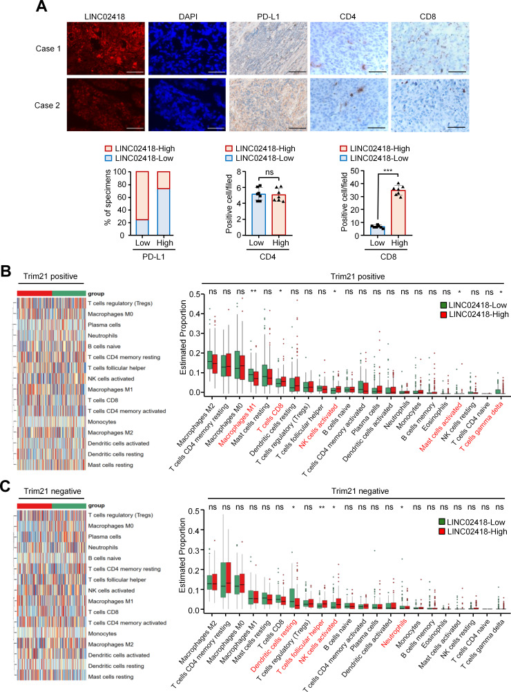 Results: LINC02418 is a negative regulator of PD-L1 expression that positively correlated with CD8+T cell infiltration, predicting favorable clinical outcomes for patients with NSCLC. LINC02418 downregulates PD-L1 expression by enhancing PD-L1 ubiquitination mediated by E3 ligase Trim21. Both hsa-LINC02418 and mmu-4930573I07Rik (its homologous RNA in mice) regulate PD-L1 therapeutic efficacy in NSCLC via Trim21, inducing T cell-induced apoptosis in vitro and in vivo. Furthermore, METTL3 inhibition via N6-methyladenosine (m6A) modification mediated by YTHDF2 reader upregulates hsa-LINC02418 and mmu-4930573I07Rik. In patients with NSCLC, LINC02418 expression is inversely correlated with PD-L1 expression and positively correlated with CD8+T infiltration.
