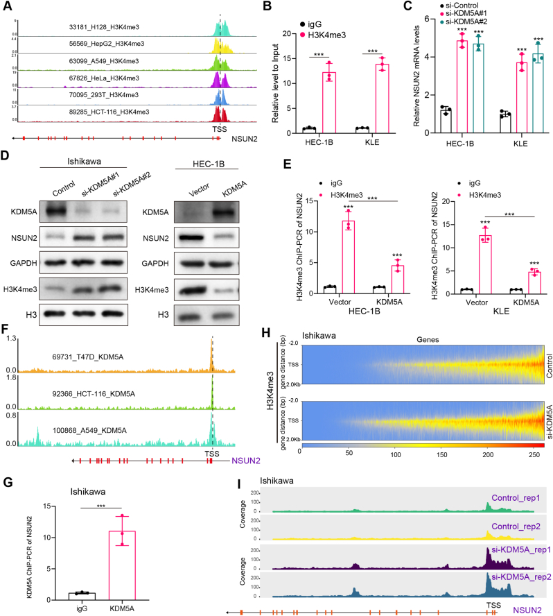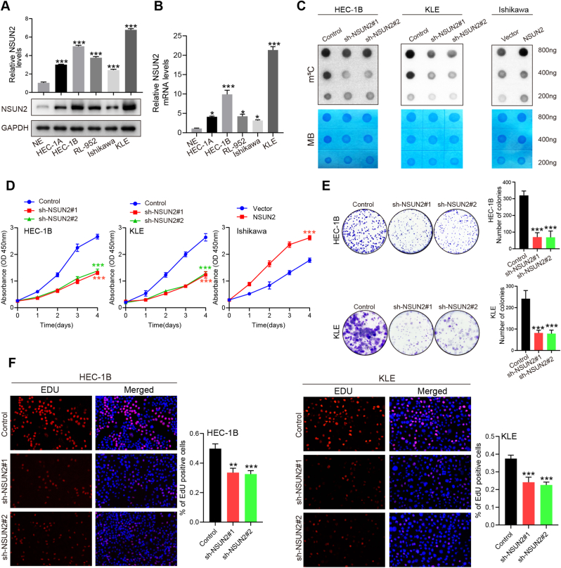 Endometrial cancer (EC) is a prevalent gynecological malignancy worldwide, and 5-methylcytosine (m5C) modification of mRNA is a crucial epigenetic modification associated with the development and occurrence of several cancers. However, the precise function of m5C modification in EC remains elusive. This study aimed to investigate the expression and clinical significance of the primary m5C modification writer, NSUN2, in EC. Our findings indicated that NSUN2 exhibited a substantial up-regulation in EC as a result of an epigenetic augmentation in H3K4me3 levels within the promoter region, which was triggered by the down-regulation of KDM5A. Moreover, gain- and loss-of-function experiments revealed the role of NSUN2 in enhancing m5C modification of mRNA, thereby promoting EC cell proliferation. RNA bisulfite sequencing and transcriptomic sequencing were employed to elucidate the involvement of NSUN2 in the regulation of ferroptosis. Subsequent in vitro experiments confirmed that the knockdown of NSUN2 significantly up-regulated the levels of lipid peroxides and lipid ROS in EC cells, thereby augmenting the susceptibility of EC to ferroptosis. Mechanistically, NSUN2 stimulated the m5C modification of SLC7A11 mRNA, and the m5C reader YBX1 exhibited direct recognition and binding to the m5C sites on SLC7A11 mRNA via its internal cold shock domain (CSD), leading to an increase in SLC7A11 mRNA stability and elevated levels of SLC7A11. Additionally, rescue experiments showed that NSUN2 functioned as a suppressor of ferroptosis, which was dependent on SLC7A11. Overall, targeting the NSUN2/SLC7A11 axis inhibited tumor growth by increasing lipid peroxidation and ferroptosis of EC cells both in vitro and in vivo. Therefore, our study provides new insight into the role of NSUN2, suggesting that NSUN2 may serve as a prognostic biomarker and therapeutic target in patients with EC.