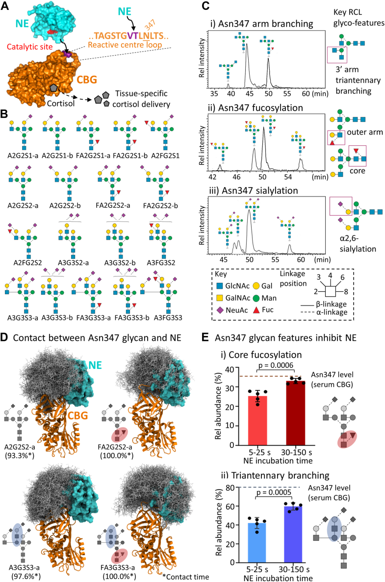 Corticosteroid-binding globulin (CBG) delivers anti-inflammatory cortisol to inflamed tissues through proteolysis of an exposed reactive center loop (RCL) by neutrophil elastase (NE). We previously demonstrated that RCL-localized Asn347-linked N-glycans impact NE proteolysis, but a comprehensive structure-function characterization of the RCL glycosylation is still required to better understand CBG glycobiology. Herein, we first performed RCL-centric glycoprofiling of serum-derived CBG to elucidate the Asn347-glycans and then used molecular dynamics simulations to study their impact on NE proteolysis. Importantly, we also identified O-glycosylation (di/sialyl T) across four RCL sites (Thr338/Thr342/Thr345/Ser350) of serum CBG close to the NE-targeted Val344-Thr345 cleavage site. A restricted N- and O-glycan co-occurrence pattern on the RCL involving exclusively Asn347 and Thr338 glycosylation was experimentally observed and supported in silico by modeling of a CBG-GalNAc-transferase (GalNAc-T) complex with various RCL glycans. GalNAc-T2 and GalNAc-T3 abundantly expressed by liver and gall bladder, respectively, showed in vitro a capacity to transfer GalNAc (Tn) to multiple RCL sites suggesting their involvement in RCL O-glycosylation. Recombinant CBG was then used to determine roles of RCL O-glycosylation through longitudinal NE-centric proteolysis experiments, which demonstrated that both sialoglycans (disialyl T) and asialoglycans (T) decorating Thr345 inhibit NE proteolysis. Synthetic RCL O-glycopeptides expanded on these findings by showing that Thr345-Tn and Thr342-Tn confer strong and moderate protection against NE cleavage, respectively. Molecular dynamics substantiated that short Thr345-linked O-glycans abrogate NE interactions. In conclusion, we report on biologically relevant CBG RCL glycosylation events, which improve our understanding of mechanisms governing cortisol delivery to inflamed tissues.
