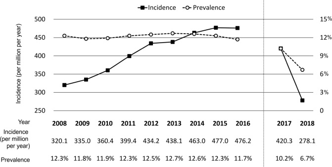 Objective: We aimed to measure the incidence, prevalence, characteristics and outcomes of intensive care unit (ICU) patients with early (first 24 hours) metabolic acidosis (MA) according to two different levels of severity with a focus on recent data. Design: We retrospectively applied two diagnostic criteria to our analysis based on literature for early MA: i) severe MA criteria (pH ≤ 7.20 and Paco2 ≤ 45 mmHg and HCO3- ≤ 20 mmol/L with total Sequential Organ Failure Assessment [SOFA] score ≥ 4 or lactate ≥ 2 mmol/L), and ii) moderate MA criteria (pH < 7.30 and base excess < -4 mmol/L and Paco2 ≤ 45 mmHg). Setting: ICUs in the Australian and New Zealand Intensive Care Society Adult Patient Database program. Participants: Adult patients registered to the database from 2008 to 2018. Main outcome measures: Incidence, prevalence, and hospital mortality of patients with MA by the two criteria. Results: We screened 1 076 087 patients. Given the Australian and New Zealand population during the study period, we estimated the incidence of severe MA at 39.5 per million per year versus 349.2-411.5 per million per year for moderate MA. In the most recent 2 years, we observed early severe MA in 1.5% (1350/87 110) of patients compared with 8.4% (20 679/244 740) for moderate MA. Overall, hospital mortality for patients with early severe MA was 48.3% (652/1350) compared with 21.5% (4444/20 679) for moderate MA. Conclusions: Early severe MA is uncommon in Australian and New Zealand ICUs and carries a very high mortality. Moderate MA is over seven-fold more common and still carries a high mortality.