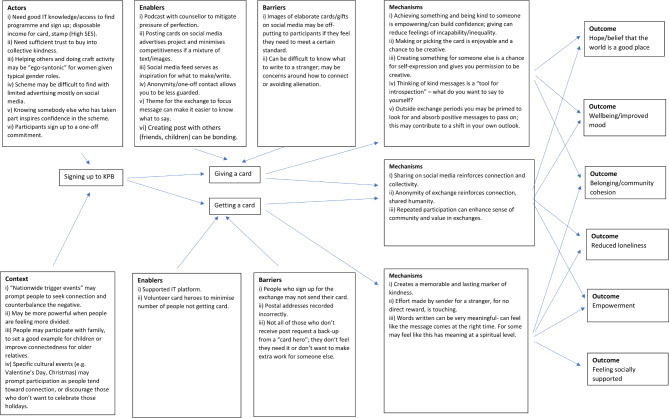 Results: We developed 145 CMO statements, which we condensed and categorized into 32 overarching CMOs across nine thematic topics: access to scheme; pathways to involvement; resources; culture; giving post; receiving post; content of received post; community; long term impact. These CMOs set out pathways through which KbP benefited participants, including from doing something kind for someone else, of receiving post and appreciating the effort that went into it, and from the creative process of creating post and writing the messages inside them. Effects were sustained in part through people keeping the cards and through the social media communities that emerged around KbP.