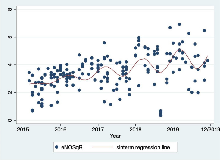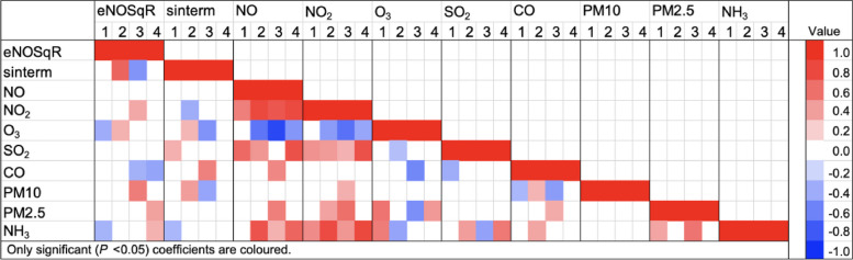 Results: A seasonal variation was evident with higher median exhaled nitric oxide levels (13.6 ppb) in warmer months and lower median exhaled nitric oxide levels (11.0 ppb) in cooler months, P = 0.008. LASSO identified positive associations for exhaled nitric oxide with 24-h mean ammonia, seven-day mean ammonia, seven-day mean PM10, seven-day mean PM2.5, and seven-day mean ozone; and negative associations for eNO with seven-day mean carbon monoxide, 24-h mean nitric oxide and 24-h mean sulfur dioxide, with an R-square of 0.25 for the penalized coefficients. These coefficients selected by LASSO (and confounders) were entered in multivariable regression. The achieved R-square was 0.27.