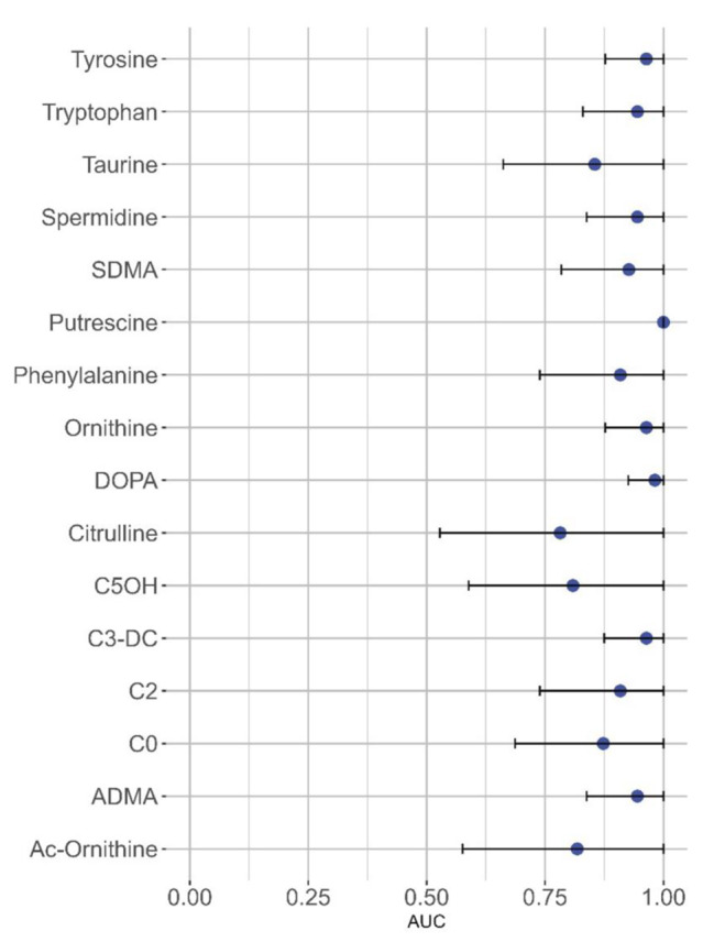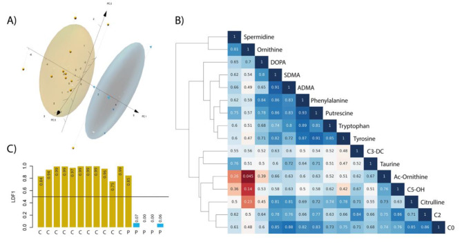 Methods: A targeted metabolomics approach with concentration determination by mass spectrometry was used. Statistical methods including principal component analysis and linear discriminants were used to select differentially concentrated metabolites that allow distinguishing patients from controls.