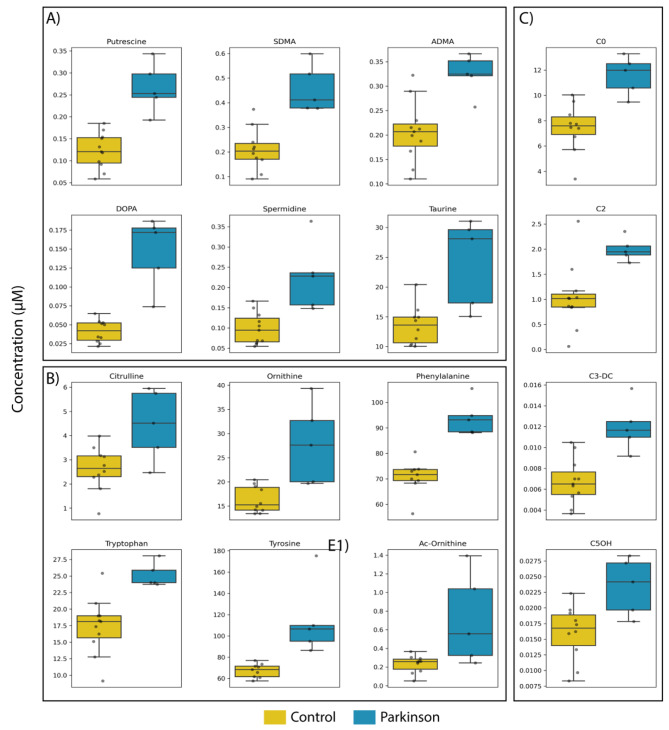 Results: In this first metabolomics study in the aqueous humor of PD patients, elevated levels of 16 compounds were found; molecules differentially concentrated grouped into biogenic amines, amino acids, and acylcarnitines. A biogenic amine, putrescine, alone could be a metabolite capable of differentiating between PD and control samples. The altered levels of the metabolites were correlated, suggesting that the elevations stem from a common mechanism involving arginine metabolism.