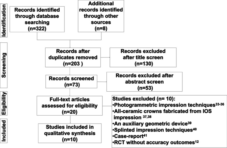 Conclusions: The accuracy of IOS impressions of implant-supported restorations varied greatly depending on the scanning strategy. The trueness and precision of IOS in the partial and complete arches remain unclear and require further assessment. Based on follow-up clinical studies, IOS impressions were accurate in clinical practice. However, these results should be interpreted with caution, as some evidences are obtained from the same research group.