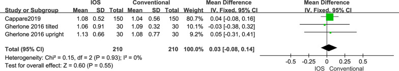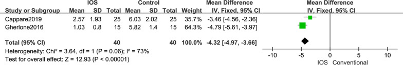 Results: Ten in vivo studies were included in this systematic review for final analysis. Six studies investigated the trueness of IOS impressions, but did not reach the same conclusions. One study assessed the precision of IOS impressions for a single implant. Four clinical studies examined the accuracy of IOS implant impressions with a follow-up of 1-2 years. In full arches, IOS impression procedure needed significantly less time than conventional one (mean difference for procedure time was 8.59 min [6.78, 10.40 min], P < 0.001), prosthetic survival rate was 100%, and marginal bone levels of all participants could be stably maintained (mean difference in marginal bone loss at 12 months was 0.03 mm [-0.08, 0.14 mm], P = 0.55).