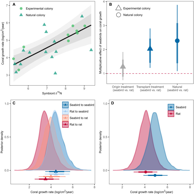 Global climate change threatens tropical coral reefs, yet local management can influence resilience. While increasing anthropogenic nutrients reduce coral resistance and recovery, it is unknown how the loss, or restoration, of natural nutrient flows affects reef recovery. Here, we test how natural seabird-derived nutrient subsidies, which are threatened by invasive rats, influence the mechanisms and patterns of reef recovery following an extreme marine heatwave using multiyear field experiments, repeated surveys, and Bayesian modeling. Corals transplanted from rat to seabird islands quickly assimilated seabird-derived nutrients, fully acclimating to new nutrient conditions within 3 years. Increased seabird-derived nutrients, in turn, caused a doubling of coral growth rates both within individuals and across entire reefs. Seabirds were also associated with faster recovery time of Acropora coral cover (<4 years) and more dynamic recovery trajectories of entire benthic communities. We conclude that restoring seabird populations and associated nutrient pathways may foster greater coral reef resilience through enhanced growth and recovery rates of corals.