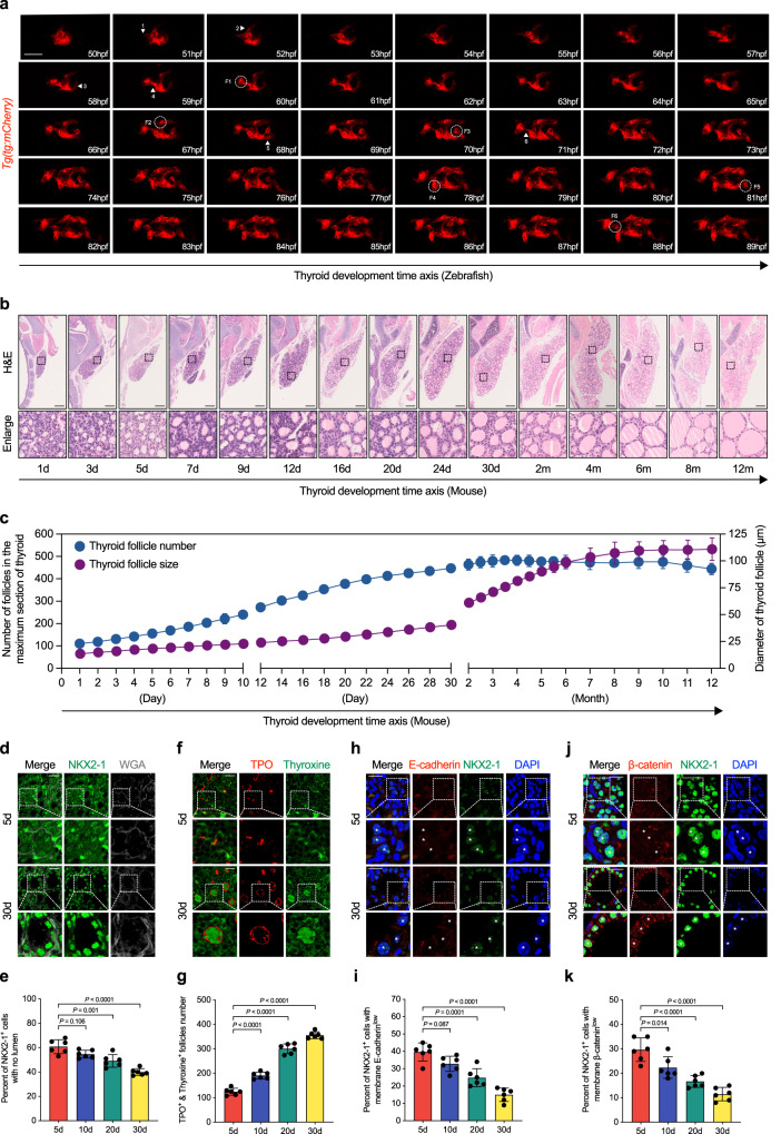 The pathogenesis of thyroid dysgenesis (TD) is not well understood. Here, using a combination of single-cell RNA and spatial transcriptome sequencing, we identify a subgroup of NF-κB-activated thyrocytes located at the center of thyroid tissues in postnatal mice, which maintained a partially mesenchymal phenotype. These cells actively protruded out of the thyroid primordium and generated new follicles in zebrafish embryos through continuous tracing. Suppressing NF-κB signaling affected thyrocyte migration and follicle formation, leading to a TD-like phenotype in both mice and zebrafish. Interestingly, during thyroid folliculogenesis, myeloid cells played a crucial role in promoting thyrocyte migration by maintaining close contact and secreting TNF-α. We found that cebpa mutant zebrafish, in which all myeloid cells were depleted, exhibited thyrocyte migration defects. Taken together, our results suggest that myeloid-derived TNF-α-induced NF-κB activation plays a critical role in promoting the migration of vertebrate thyrocytes for follicle generation.