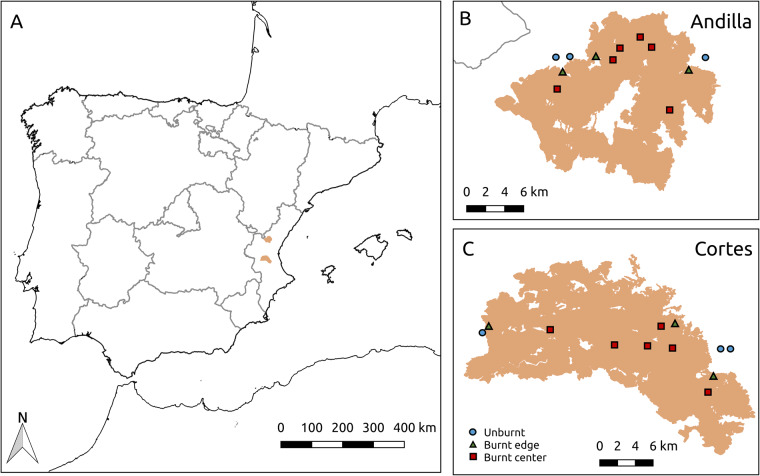 In the summer of 2012, two fires affected Mediterranean ecosystems in the eastern Iberian Peninsula. The size of these fires was at the extreme of the historical variability (megafires). Animals are traditionally assumed to recolonize from source populations outside of the burned area (exogenous regeneration) while plants recover from endogenous regeneration (resprouting and seeding). However, there is increasing evidence of in situ fire survival in animals. To evaluate the effect of large-scale fires on biodiversity and the mechanism of recovery, in 2013, we set up 12 plots per fire, covering burned vegetation at different distances from the fire perimeter and unburned vegetation. In each plot, we followed the postfire recovery of arthropods, reptiles (including some of their parasites), and plants for 2 to 5 years. Here we present the resulting database (POSTDIV) of taxon abundance. POSTDIV totals 19,906 records for 457 arthropod taxa (113,681 individuals), 12 reptile taxa (503 individuals), 4 reptile parasites (234 individuals), and 518 plant taxa (cover-abundance). We provide examples in the R language to query the database.