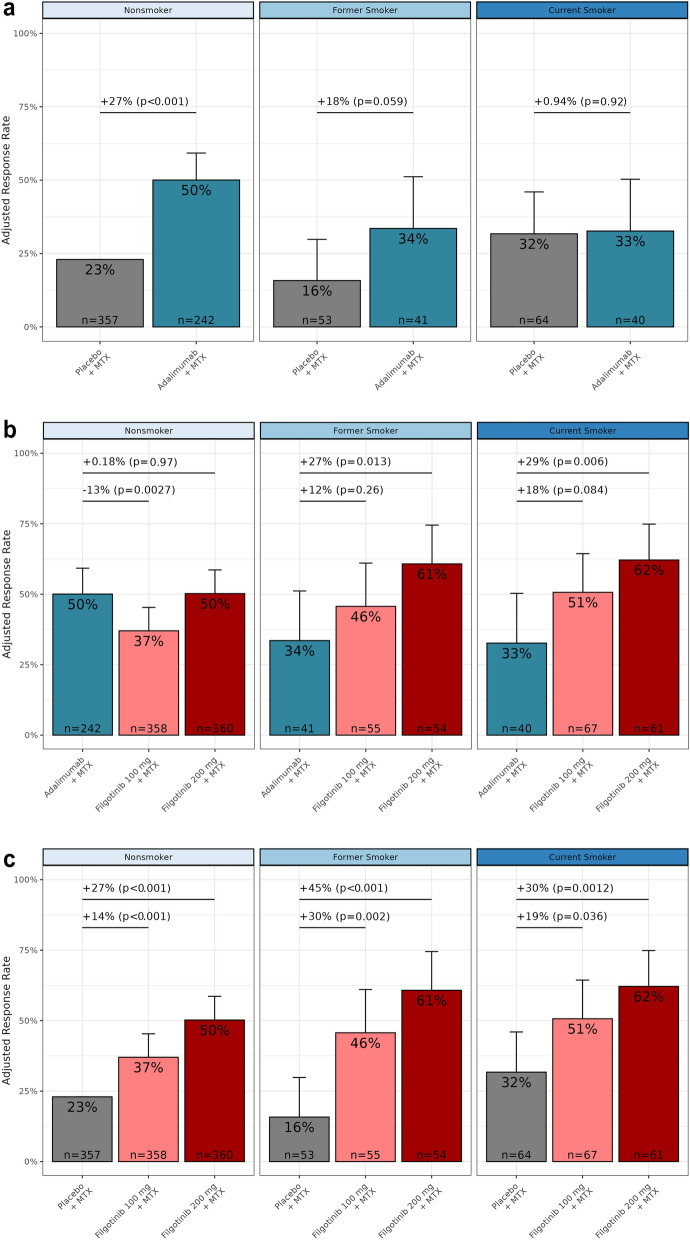 Conclusions: Greater proportions of MTX-IR current/former smokers responded to FIL200 + MTX vs. adalimumab + MTX. In non-smoking MTX-IR, bDMARD-IR, and MTX-naïve patients with RA, FIL200 + MTX demonstrated increased response vs. controls. Current/former smokers were likelier to discontinue adalimumab vs. non-smokers in real-world clinical settings.