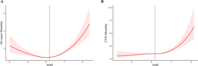 Results: The study documented 2,463 deaths over 68,542 person-years, including 853 deaths from CVD and 424 from cancer. An increase in SII was significantly associated with higher all-cause and CVD mortality risk after multivariate adjustment. For each standard deviation increment in natural log transformed SII (lnSII), all-cause mortality increased by 17%, and CVD mortality increased by 34% (both P < 0.001). Additionally, the association between SII and all-cause mortality was U-shaped, with the inflection point at 6.02. The association between SII and CVD mortality was non-linear and J-shaped, where the risk increased significantly when lnSII exceeded 6.22. Furthermore, the association between SII and CVD mortality was attenuated in female and hyperlipidemia patients.