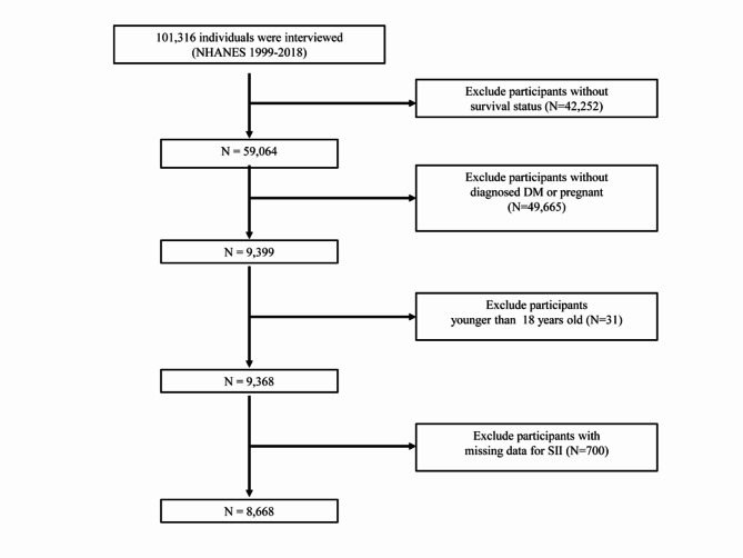 Methods: The study included 8,668 participants with diabetes from the National Health and Nutrition Examination Survey (NHANES) 1999-2018 with follow-up until 31 December 2019. The calculation of SII in this study was performed using the following formula: the neutrophil-to-lymphocyte ratio multiplied by the platelet count (10^9 cells/µL).