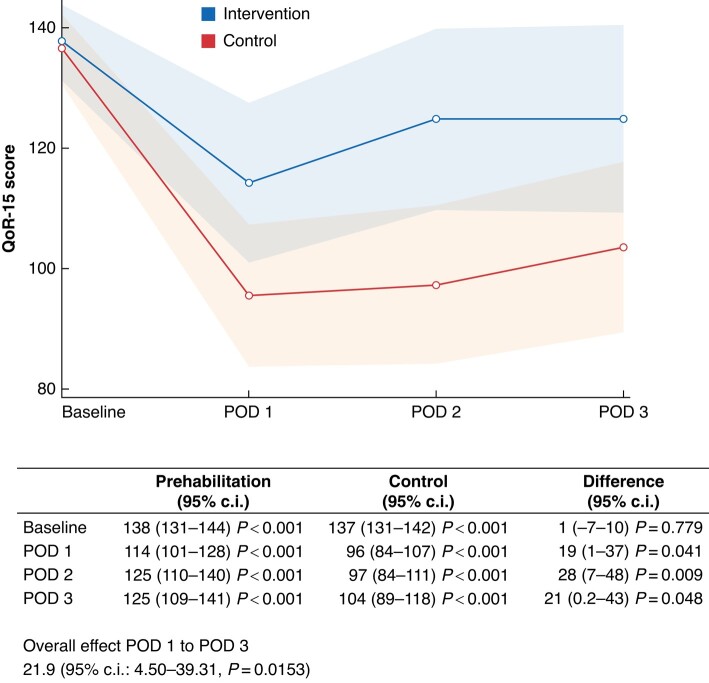 Results: In total, 36 patients were analysed with 16 in the intervention group and 20 in the control group. The mean age of the included patients was 79 years. The overall treatment effect associated with the intervention was a 21.9 (95% c.i. 4.5-39.3) higher quality of recovery-15 score during the first 3 postoperative days compared to control, well above the minimal clinically relevant difference.