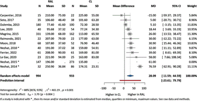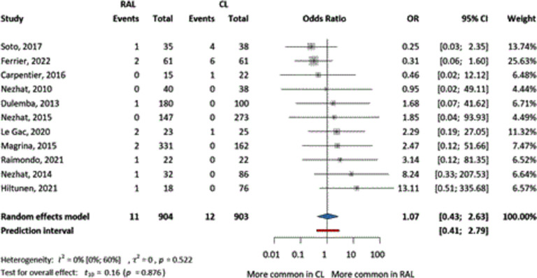 Results: Our search yielded 2,014 records, of which 13 were eligible for data extraction. No significant differences were detected between the CL and RAL groups in terms of intraoperative complications (OR = 1.07, CI 0.43-2.63), postoperative complications (OR = 1.3, CI 0.73-2.32), number of conversions to open surgery (OR = 1.34, CI 0.76-2.37), length of hospital stays (MD = 0.12, CI 0.33-0.57), blood loss (MD = 16.73, CI 4.18-37.63) or number of rehospitalizations (OR = 0.95, CI 0.13-6.75). In terms of operative times (MD = 28.09 min, CI 11.59-44.59) and operating room times (MD = 51.39 min, CI 15.07-87.72;), the RAL technique remained inferior.