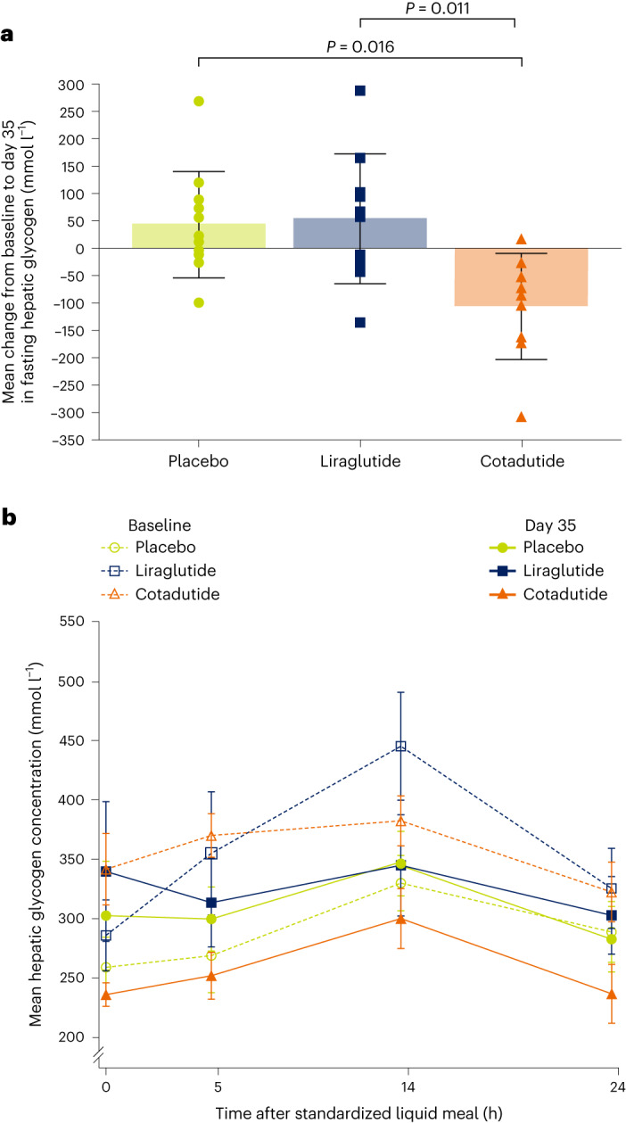 Cotadutide is a dual glucagon-like peptide 1 and glucagon receptor agonist under development for the treatment of non-alcoholic steatohepatitis and type 2 diabetes mellitus (T2DM) and chronic kidney disease. Non-alcoholic steatohepatitis is a complex disease with no approved pharmacotherapies, arising from an underlying state of systemic metabolic dysfunction in association with T2DM and obesity. Cotadutide has been shown to improve glycaemic control, body weight, lipids, liver fat, inflammation and fibrosis. We conducted a two-part, randomized phase 2a trial in men and women with overweight or obesity diagnosed with T2DM to evaluate the efficacy and safety of cotadutide compared with placebo and liraglutide. The primary endpoints were change from baseline to day 28 of treatment in postprandial hepatic glycogen (part A) and to day 35 of treatment in fasting hepatic glycogen (part B) with cotadutide versus placebo. Secondary endpoints in part B were changes in fasting hepatic glycogen with cotadutide versus the mono glucagon-like peptide 1 receptor agonist, liraglutide, and change in hepatic fat fraction. The trial met its primary endpoint. We showed that cotadutide promotes greater reductions in liver glycogen and fat compared with placebo and liraglutide. Safety and tolerability findings with cotadutide were comparable to those of previous reports. Thus, this work provides evidence of additional benefits of cotadutide that could be attributed to glucagon receptor engagement. Our results suggest that cotadutide acts on the glucagon receptor in the human liver to promote glycogenolysis and improve the metabolic health of the liver. ClinicalTrials.gov registration: NCT03555994 .