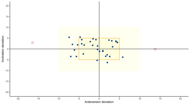 Results: The preparation for PSI required an average of 3 days. 94% of cup size and 91% of stem size were correctly selected. The mean values of postoperative inclination and anteversion were 44.2° ± 4.1° and 19.2° ± 5.6°, respectively. 64.7% of cases deviated from planned within the ± 50 range and 94.1% within the ± 10° range. There was no significant statistical difference between the planned and the achieved values of stem anteversion, osteotomy height, and leg length discrepancy (p > 0.05). The average surgical time was 82.5° ± 10.8 min, and the intraoperative blood loss was estimated at 317.7° ± 57.6 ml. 64.7% of patients could walk on the day of surgery. There were no complications reported.