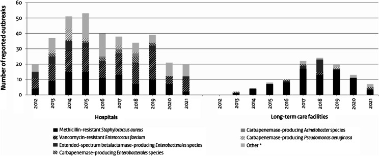 Results: In total, 353 hospital outbreaks and 110 LTCF outbreaks were reported. Most outbreaks (hospitals: n = 309 (88%), LTCF: n = 103 (94%)) did not progress beyond phase 1 (no public health implications, outbreak expected to be controlled within two months), one hospital outbreak reached phase 4 (insufficient/ineffective response: possible public health threat, support offered). Highly resistant microorganisms (HRMO) were involved in 269 (76%) hospital and 103 (94%) LTCF outbreaks. Most outbreaks were caused by methicillin-resistant Staphylococcus aureus (MRSA; n = 93 (26%) in hospitals, n = 80 (72%) in LTCF), vancomycin-resistant Enterococcus faecium (VRE; n = 116 (33%) in hospitals, n = 2 (2%) in LTCF) and highly resistant Enterobacterales (n = 41 (12%) in hospitals, n = 20 (18%) in LTCF). Carbapenemase-producing gram-negative bacteria were involved in 32 (9.1%) hospital and five (4.5%) LTCF outbreaks. In hospitals, VRE outbreaks had the longest duration (median 2.3; range 0.0-22.8 months) and widest range of affected patients (median 9; range 2-483).