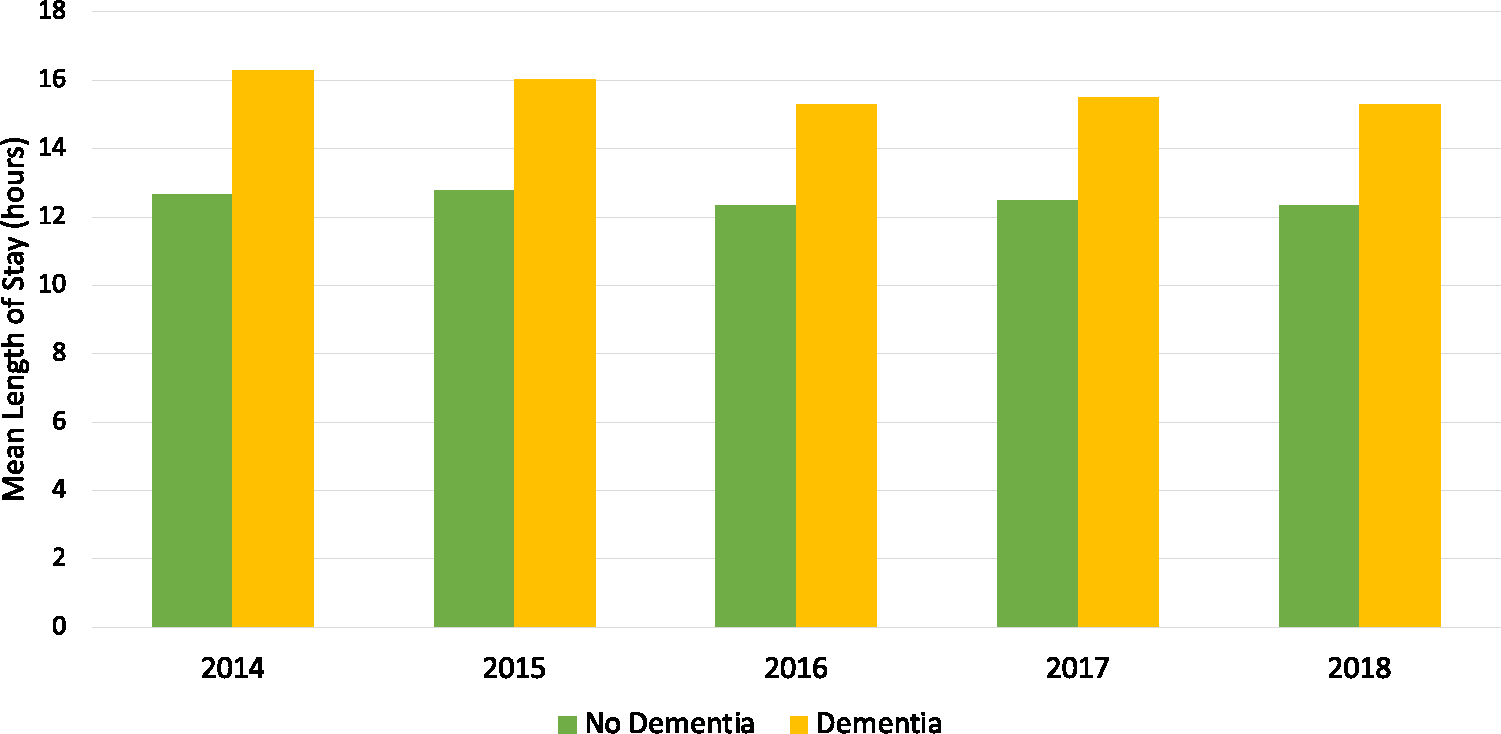Study objective: The emergency department (ED) poses unique challenges and risks to persons living with dementia. A longer ED length of stay is associated with the risk of death, delirium, and medication errors. We sought to determine whether ED length of stay differed by dementia status and trends in ED length of stay for persons living with dementia from 2014 to 2018 and whether persons living with dementia were at a higher risk for prolonged ED length of stay (defined as a length of stay > 90th percentile).