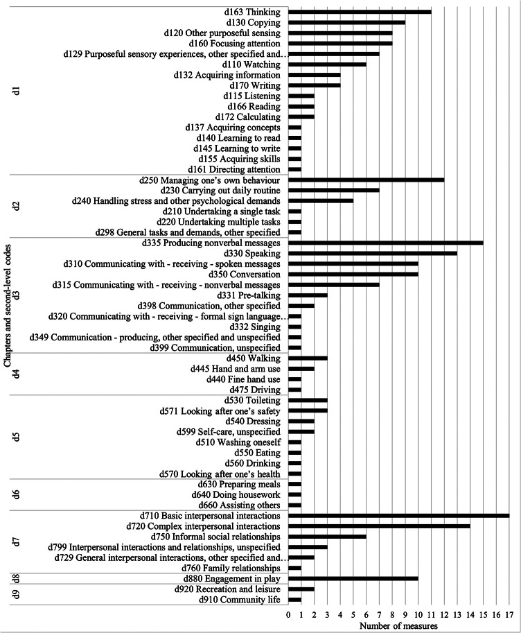 Results: As expected, screening and diagnostic measures primarily focus on body functions and activities and participation domains of the ICF, and much less on environmental factors, reflecting biomedical and adaptive behavior operationalizations of autism derived from diagnostic manuals.