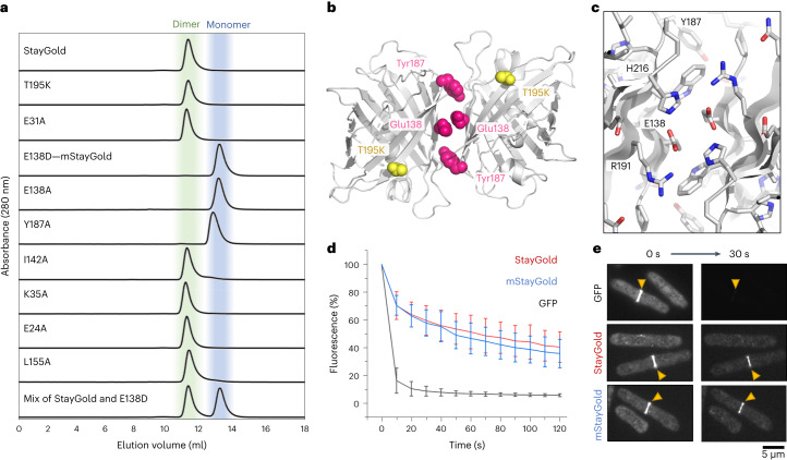 StayGold is an exceptionally bright and stable fluorescent protein that is highly resistant to photobleaching. Despite favorable fluorescence properties, use of StayGold as a fluorescent tag is limited because it forms a natural dimer. Here we report the 1.6 Å structure of StayGold and generate a derivative, mStayGold, that retains the brightness and photostability of the original protein while being fully monomeric.