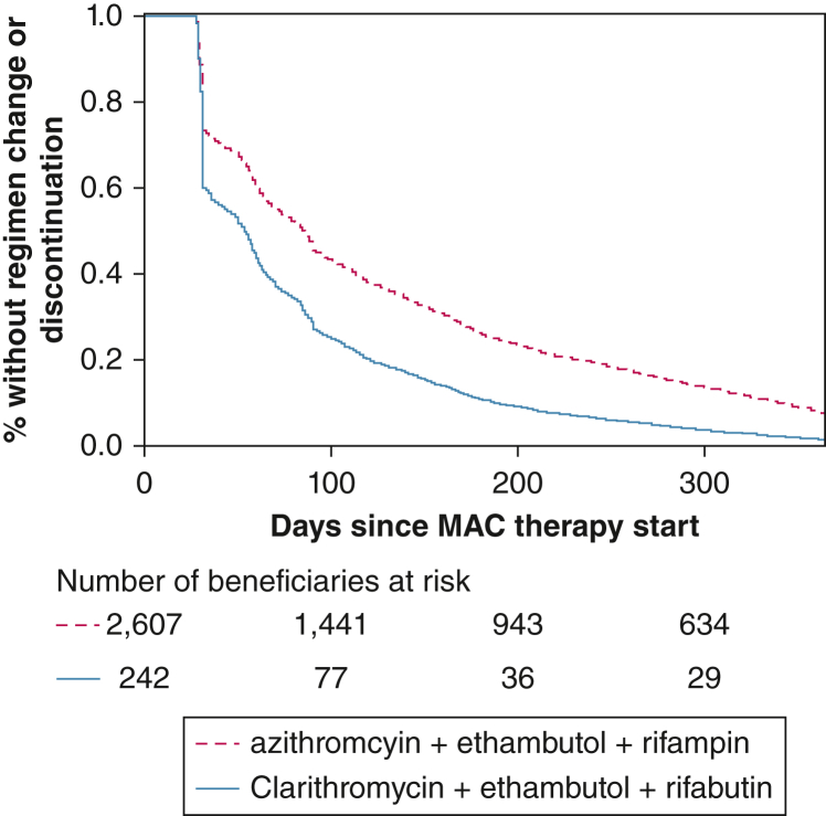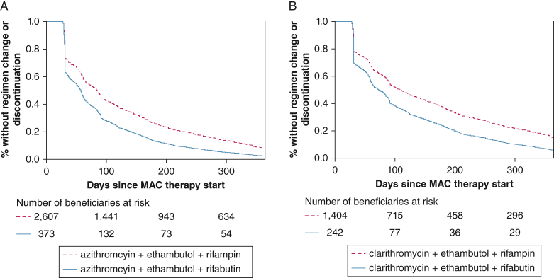 Results: The cohort had a mean age ± SD of 77.9 ± 6.1 years at treatment start, were mostly female (77.7%), and were mostly non-Hispanic White (87.2%). The risk of regimen change/discontinuation within 12 months of therapy was higher for clarithromycin-based regimens than azithromycin-based regimens (aHR, 1.12; 95% CI, 1.04-1.20 with rifampin; aHR, 1.11; 95% CI, 0.93-1.32 with rifabutin as the companion rifamycin), and for rifabutin-containing regimens than rifampin-containing regimens (aHR, 1.49; 95% CI, 1.33-1.68 with azithromycin; aHR, 1.47; 95% CI, 1.27-1.70 with clarithromycin as the companion macrolide). The aHR comparing regimen change/discontinuation with clarithromycin-ethambutol-rifabutin and azithromycin-ethambutol-rifampin was 1.64 (95% CI, 1.43-1.64).