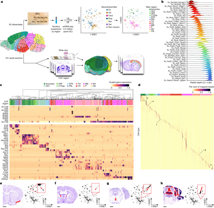 The function of the mammalian brain relies upon the specification and spatial positioning of diversely specialized cell types. Yet, the molecular identities of the cell types and their positions within individual anatomical structures remain incompletely known. To construct a comprehensive atlas of cell types in each brain structure, we paired high-throughput single-nucleus RNA sequencing with Slide-seq1,2-a recently developed spatial transcriptomics method with near-cellular resolution-across the entire mouse brain. Integration of these datasets revealed the cell type composition of each neuroanatomical structure. Cell type diversity was found to be remarkably high in the midbrain, hindbrain and hypothalamus, with most clusters requiring a combination of at least three discrete gene expression markers to uniquely define them. Using these data, we developed a framework for genetically accessing each cell type, comprehensively characterized neuropeptide and neurotransmitter signalling, elucidated region-specific specializations in activity-regulated gene expression and ascertained the heritability enrichment of neurological and psychiatric phenotypes. These data, available as an online resource ( www.BrainCellData.org ), should find diverse applications across neuroscience, including the construction of new genetic tools and the prioritization of specific cell types and circuits in the study of brain diseases.
