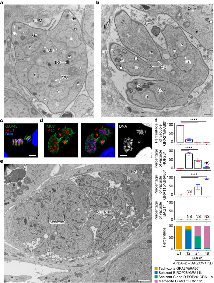 Sexual reproduction of Toxoplasma gondii, confined to the felid gut, remains largely uncharted owing to ethical concerns regarding the use of cats as model organisms. Chromatin modifiers dictate the developmental fate of the parasite during its multistage life cycle, but their targeting to stage-specific cistromes is poorly described1,2. Here we found that the transcription factors AP2XII-1 and AP2XI-2 operate during the tachyzoite stage, a hallmark of acute toxoplasmosis, to silence genes necessary for merozoites, a developmental stage critical for subsequent sexual commitment and transmission to the next host, including humans. Their conditional and simultaneous depletion leads to a marked change in the transcriptional program, promoting a full transition from tachyzoites to merozoites. These in vitro-cultured pre-gametes have unique protein markers and undergo typical asexual endopolygenic division cycles. In tachyzoites, AP2XII-1 and AP2XI-2 bind DNA as heterodimers at merozoite promoters and recruit MORC and HDAC3 (ref. 1), thereby limiting chromatin accessibility and transcription. Consequently, the commitment to merogony stems from a profound epigenetic rewiring orchestrated by AP2XII-1 and AP2XI-2. Successful production of merozoites in vitro paves the way for future studies on Toxoplasma sexual development without the need for cat infections and holds promise for the development of therapies to prevent parasite transmission.
