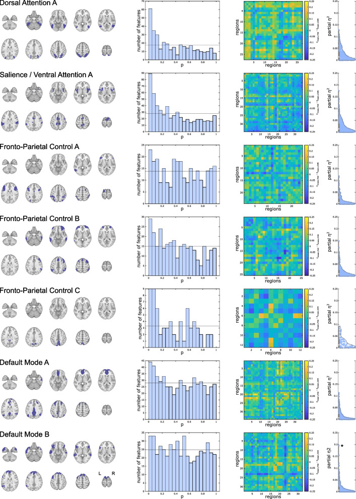 Results: Comparing FAS participants with controls, we observed altered FC of cognition-related brain regions globally, within 7 out of 10 networks, and between networks employing the HC statistic. This was most obvious in attention-related network components. Findings also spanned across subcomponents of the fronto-parietal control and default mode networks. None of the single FC alterations within these networks yielded statistical significance in the conventional high-resolution analysis. The exploratory time-resolved FC analysis did not show significant group differences of dynamic FC states.