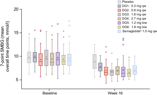 Results: A total of 413 participants were randomised (DG1, n=50; DG2, n=50; DG3, n=52; DG4, n=50; DG5, n=51; DG6, n=50; semaglutide, n=50; placebo, n=60). The full analysis set comprised 411 treated participants (DG6, n=49; placebo, n=59). Adjusted mean (95% CI) HbA1c decreased from baseline (mean ± SD 64.7±9.2 mmol/mol [8.07±0.84%] after 16 weeks' treatment: DG1 (n=41), -9.92 mmol/mol (-12.27, -7.56; -0.91% [-1.12, -0.69]); DG2 (n=46), -15.95 mmol/mol (-18.27, -13.63; -1.46% [-1.67, -1.25]); DG3 (n=36), -18.72 mmol/mol (-21.15, -16.29; -1.71% [-1.94, -1.49]); DG4 (n=33), -17.01 mmol/mol (-19.59, -14.43; -1.56% [-1.79, -1.32]); DG5 (n=44), -17.84 mmol/mol (-20.18, -15.51; -1.63% [-1.85, -1.42]); DG6 (n=36), -18.38 mmol/mol (-20.90, -15.87; -1.68% [-1.91, -1.45]). The mean reduction in HbA1c was similar with low-dose survodutide (DG2: -15.95 mmol/mol [-1.46%]; n=46) and semaglutide (-16.07 mmol/mol [-1.47%]; n=45). Mean (95% CI) bodyweight decreased dose-dependently up to -8.7% (-10.1, -7.3; DG6, n=37); survodutide ≥1.8 mg qw produced greater bodyweight reductions than semaglutide (-5.3% [-6.6, -4.1]; n=45). Adverse events (AEs) were reported for 77.8% of survodutide-treated participants (mainly gastrointestinal), 52.5% receiving placebo and 52.0% receiving semaglutide.