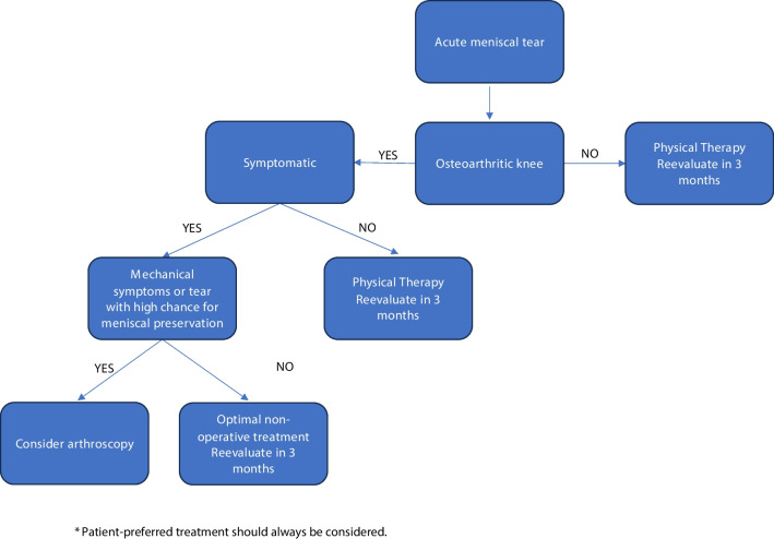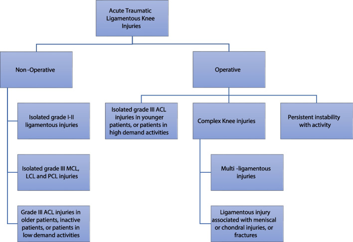 Recent findings: Aside from grade III ACL tears, most acute knee ligament injuries, especially in the absence of other concurrent injuries, can be treated non-operatively. There is new evidence that acute traumatic meniscus tears in those younger than 40 can be successfully treated non-operatively and can do equally, as well as those that undergo surgery, at 1 year out from injury. Based on the current literature, a short period of knee bracing in extension with progression to weightbearing to tolerance is recommended after initial patellar dislocation. Many of the most common acute knee injuries, including MCL tears, meniscus tears, and patellar dislocations, can be managed non-operatively. A detailed systemic approach to initial evaluation, including pertinent history, physical exam, and appropriate imaging, is essential and complementary to the subsequent non-operative treatment algorithm.
