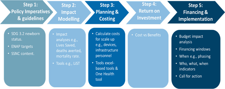 Methods: We followed five steps: (1) reviewed national targets, policies and guidelines; (2) modelled potential health benefits by increased coverage of SSNC using the Lives Saved Tool; (3) estimated setup and running costs using the Neonatal Device Planning and Costing Tool, applying two scenarios: (A) all new neonatal units and devices with optimal staffing, and (B) half new and half modifying, upgrading, or adding resources to existing neonatal units; (4) calculated budget impact and return on investment (ROI) and (5) identified potential financing opportunities.