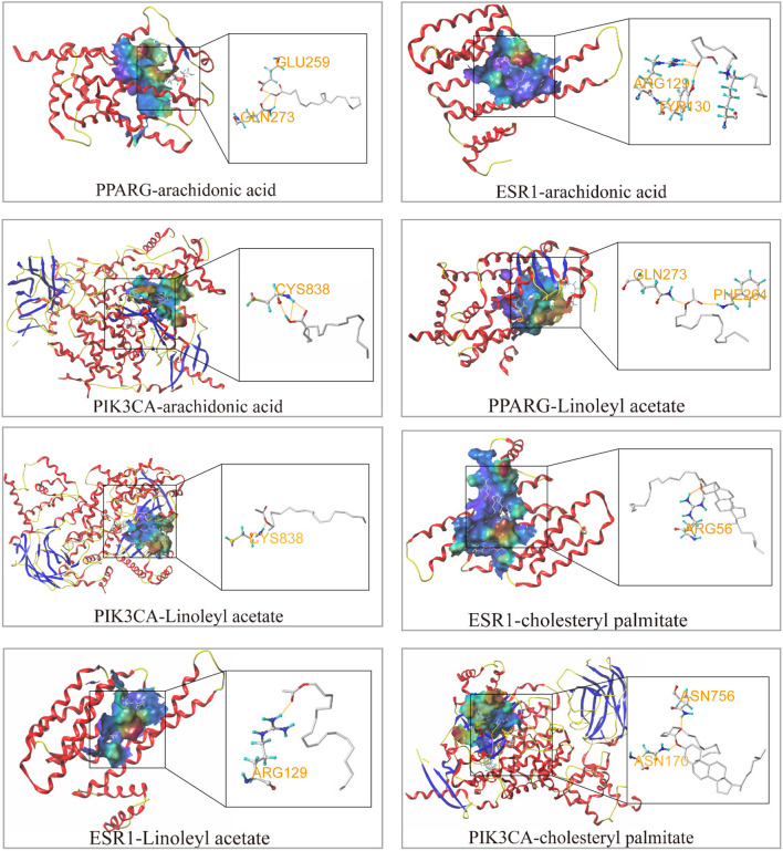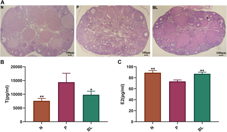 Results: The core active ingredients of BL were identified to be linoleyl acetate, cholesteryl palmitate, arachidonic acid, among others. Microarray data sets from four groups containing disease and normal samples were obtained from the GEO database. A total of 491 DEGs and 106 drug-disease cross genes were selected. Estrous cycle and ovarian lesions were found to be improved in PCOS model mice following BL treatment. While the levels of testosterone, progesterone, and prolactin decreased, that of estradiol increased. qPCR findings indicated that the expressions of JAK2, PPARG, PI3K, and AKT1 were upregulated, whereas those of ESR1 and IRS1 were downregulated in PCOS model mice. After the administration of BL, the expressions of associated genes were regulated. This study demonstrated that BL exerted anti-PCOS effects via PIK3CA, ESR1, AKT, PPARG, and IRS1 targets affecting PI3K-Akt signaling pathways.