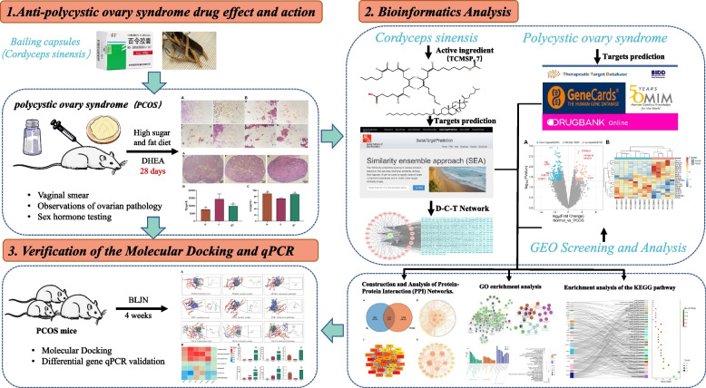 Methods: Initially, the effectiveness of BL on PCOS model mice was evaluated. Subsequently, the active ingredients of BL were searched in the TCMSP and TCM Systems Pharmacology databases, and their targets were predicted using Swiss Target Prediction and SEA databases. Furthermore, the GEO gene database was used to screen for differentially expressed genes (DEGs) related to PCOS. Data from Gene Card, OMIM, DDT, and Drugbank databases were then combined to establish a PCOS disease gene library. Cross targets were imported into the STRING database to construct a protein-protein interaction network. In addition, GO and KEGG pathway enrichment analyses were performed using Metascape and DAVID databases and visualized using Cytoscape software and R 4.2.3. The core targets were docked with SYBYL-X software, and their expressions in PCOS mice were further verified using qPCR.