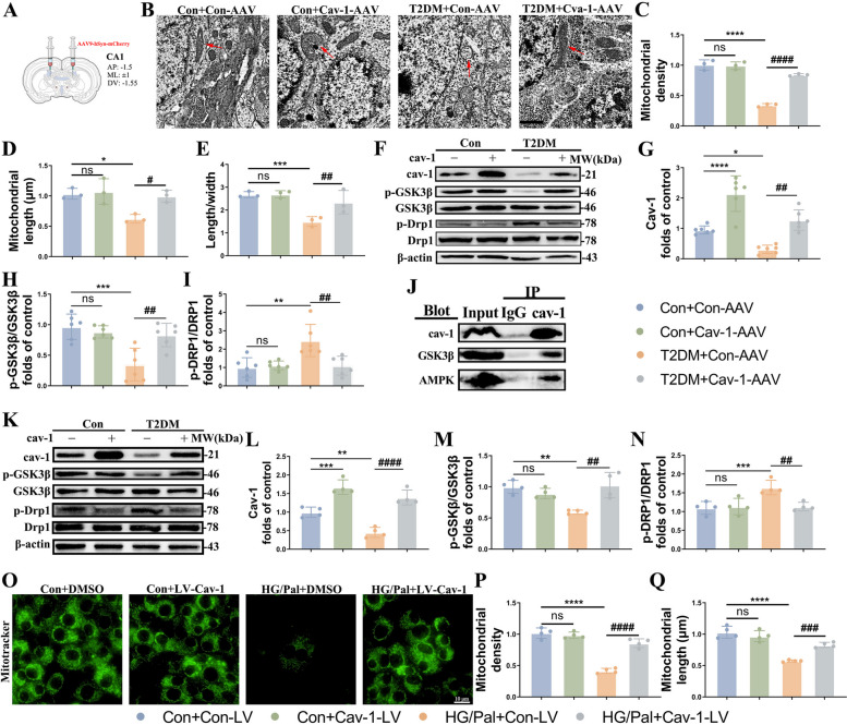 Methods: Here, we explored the underlying mechanism of mitochondrial dysfunction of T2DM mice and HT22 cells treated with high glucose/palmitic acid (HG/Pal) focusing on the mitochondrial fission-mitophagy axis with drug injection, western blotting, Immunofluorescence, and electron microscopy. We further explored the potential role of caveolin-1 (cav-1) in T2DM induced mitochondrial dysfunction and synaptic alteration through viral transduction.