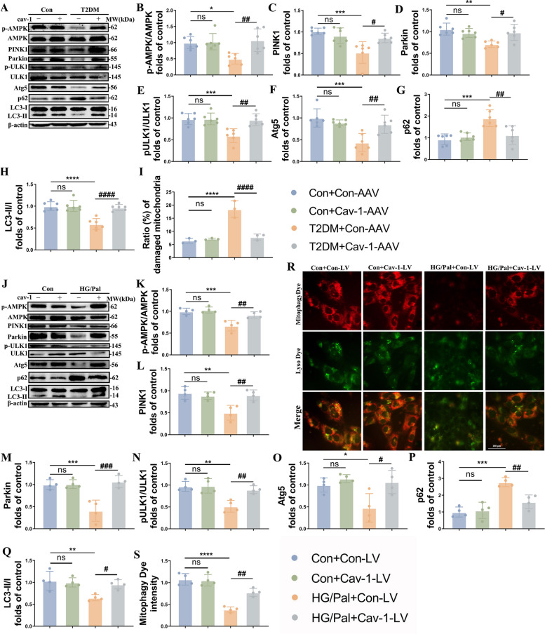 Results: As previously reported, T2DM condition significantly prompted hippocampal mitochondrial fission, whereas mitophagy was blocked rather than increasing, which was accompanied by dysfunctional mitochondria and impaired neuronal function. By contrast, Mdivi-1 (mitochondrial division inhibitor) and urolithin A (mitophagy activator) ameliorated mitochondrial and neuronal function and thereafter lead to cognitive improvement by inhibiting excessive mitochondrial fission and giving rise to mitophagy, respectively. We have previously shown that cav-1 can significantly improve DACD by inhibiting ferroptosis. Here, we further demonstrated that cav-1 could not only inhibit mitochondrial fission via the interaction with GSK3β to modulate Drp1 pathway, but also rescue mitophagy through interacting with AMPK to activate PINK1/Parkin and ULK1-dependent signlings.