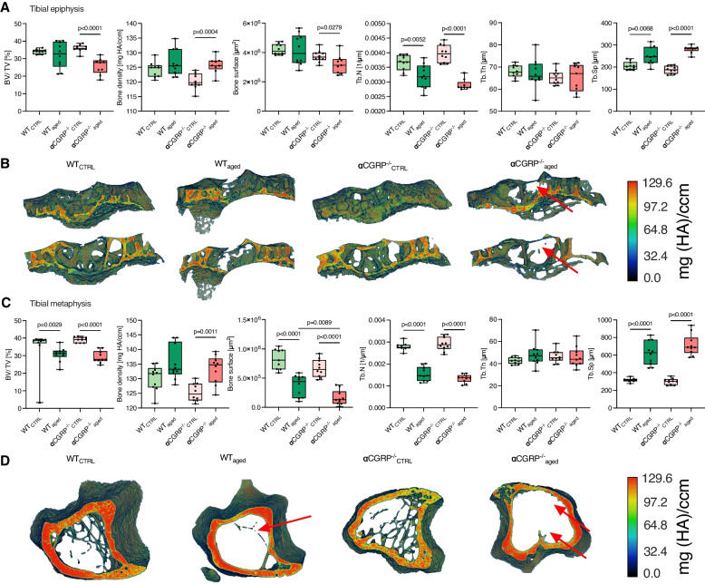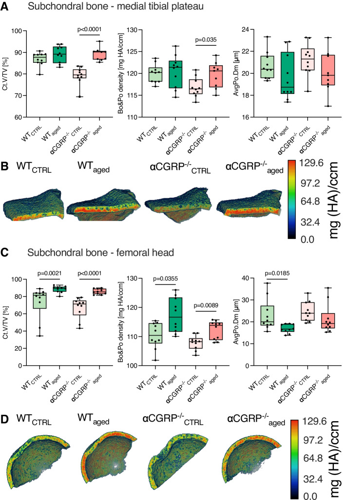 Results: WTaged mice exhibited elevated αCGRP serum levels compared to young WTCTRL animals. Marked signs of OA-induced cartilage destruction were seen in WTaged animals, while αCGRP-/-aged mice were mostly protected from this effect. Age-dependent OA was accompanied by an increased gene expression of pro-inflammatory Tnfa, Il1b, and Il6 and catabolic Mmp13, Adamts5, Ctsk, Tnfs11 (Rankl), and Cxcl12/Cxcr4 in WTaged but not in αCGRP-/-aged mice. αCGRP-deficiency however further aggravated subchondral bone sclerosis of the medial tibial plateau and accelerated bone loss in the epi- and metaphyseal trabecular tibial bone in age-dependent OA.